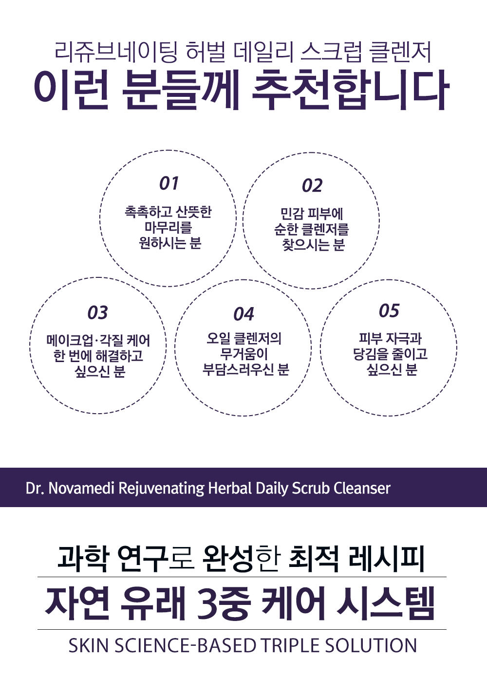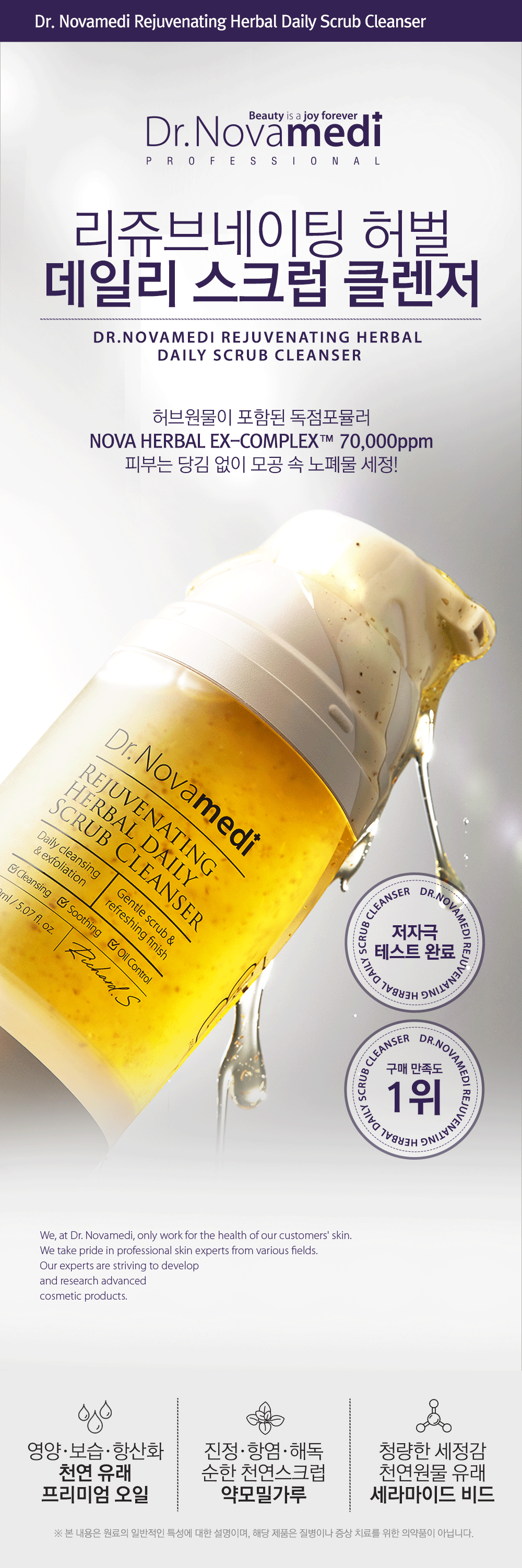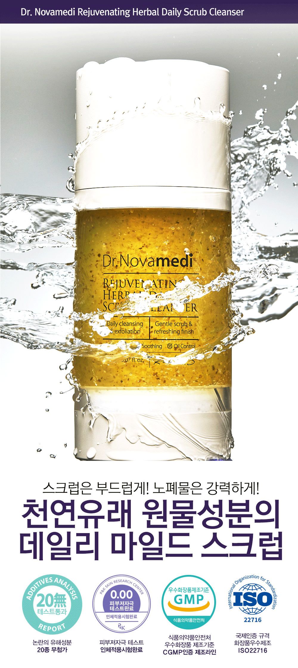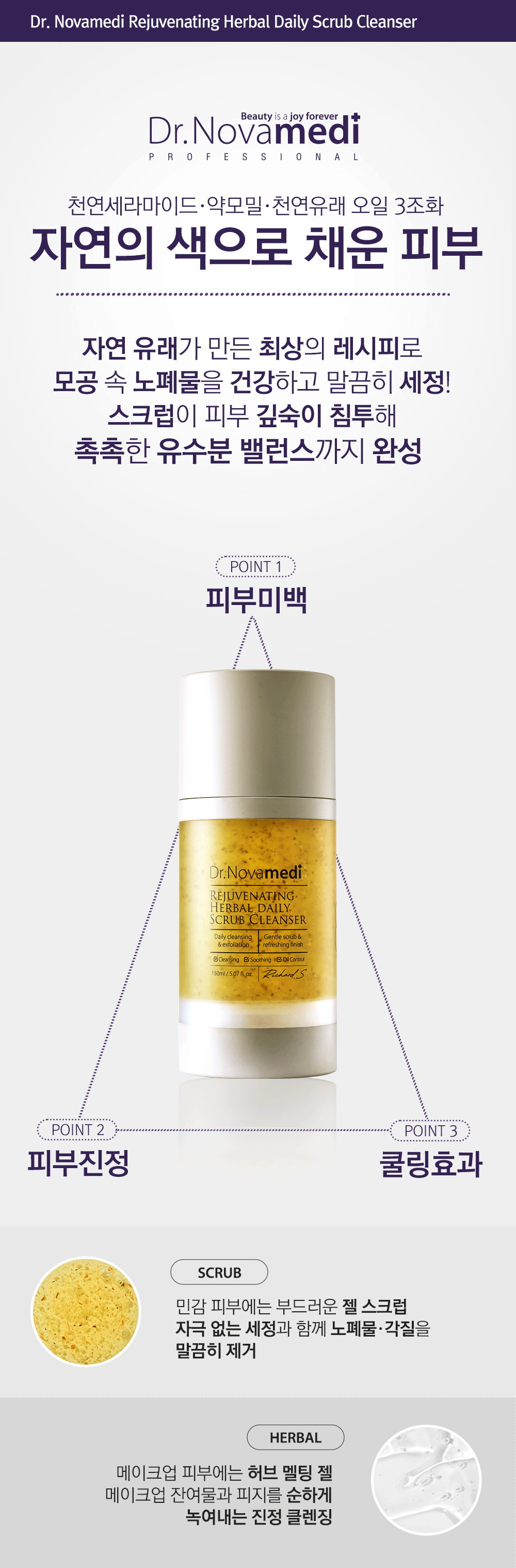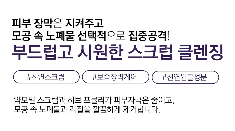 자연 유래 허벌 성분이 피부 노폐물과 각질을 부드럽게 제거하여 맑고 깨끗한 피부로 가꿔줍니다! 자외선과 각종 유해환경에 지친 피부를 부담 없는 순한 사용감으로 피부 진정과 수분 공급까지 도와줍니다.