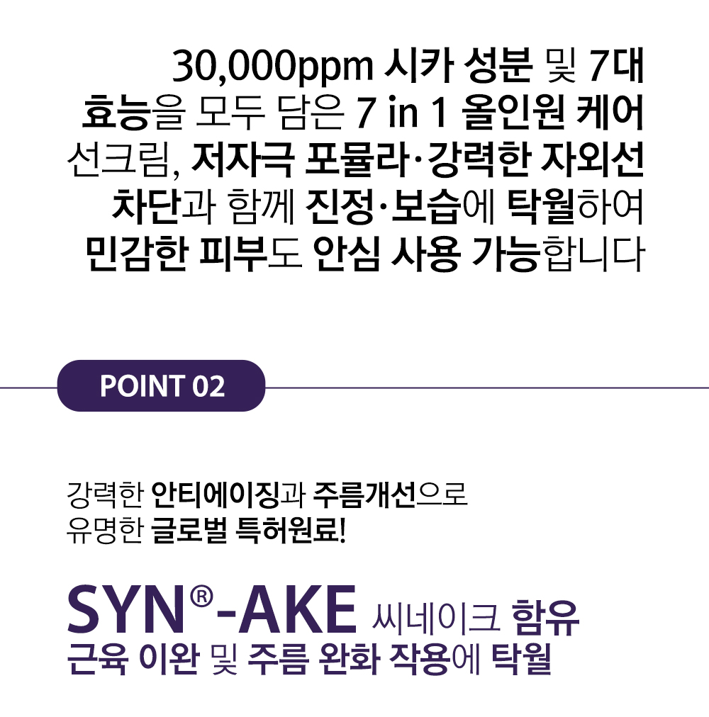 SPF50+ PA++++ 자외선 차단과 진정·보습·회복·주름개선·미백까지 5중 케어를 한 병에 담은 멀티 케어 선크림입니다. CICASOME·CCP Complex·10중 히알루론산 등 프리미엄 성분으로 피부를 빠르게 진정·회복시키고, 자연스러운 톤업과 촉촉한 물광 피부를 연출합니다. 민감 피부도 안심하고 매일 사용할 수 있는 데일리 선크림입니다.