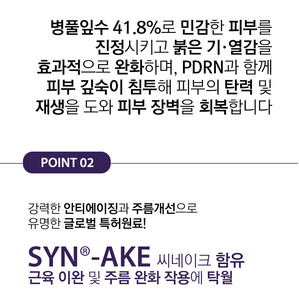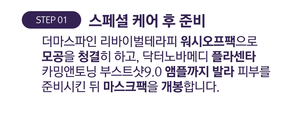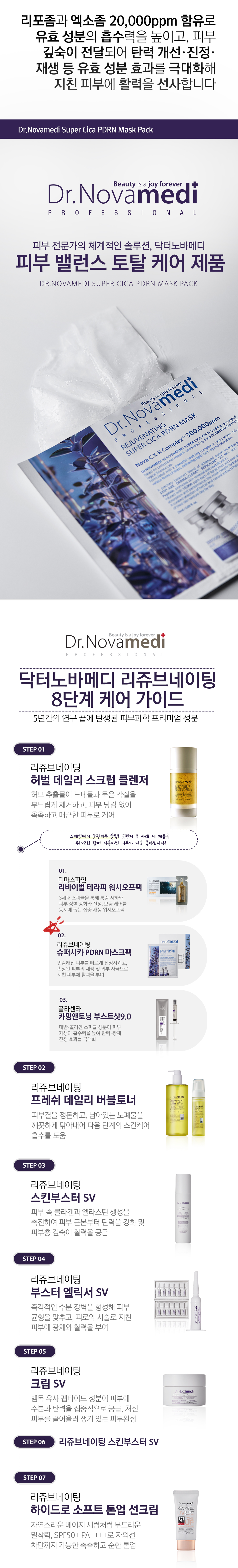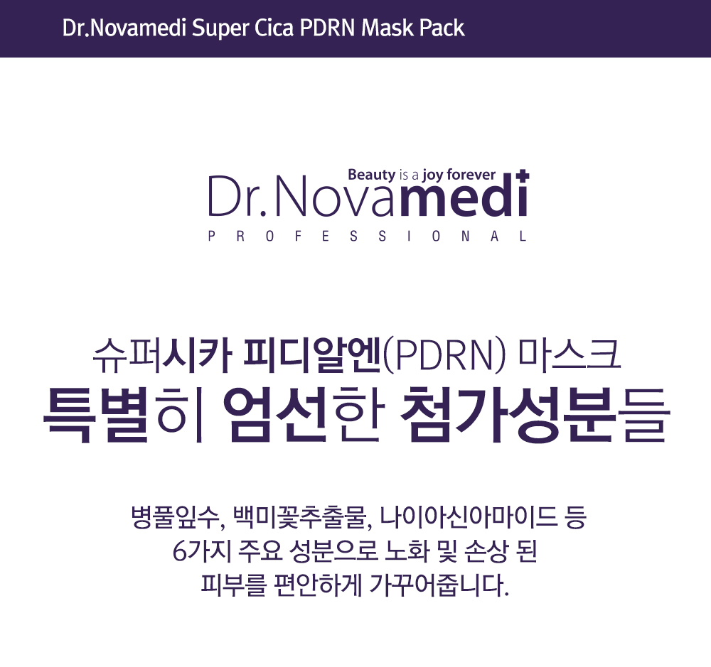 정제수 대신 병풀잎수 41.8%를 담은 닥터노바메디 슈퍼시카 PDRN 마스크팩은 즉각적인 진정 효과를 제공합니다. 병풀추출물과 PDRN의 강력한 조합이 외부 자극에 민감해진 피부를 즉각적으로 진정시키고 붉은 기와 열감을 효과적으로 완화해 줍니다. 씨네이크와 엑소좀이 깊숙이 침투하여 탄력과 재생을 책임지며, 단 한 장만으로 에스테틱에서 받은 듯한 피부 광채와 윤기를 되찾아주는 고기능성 메디컬 케어 제품입니다.