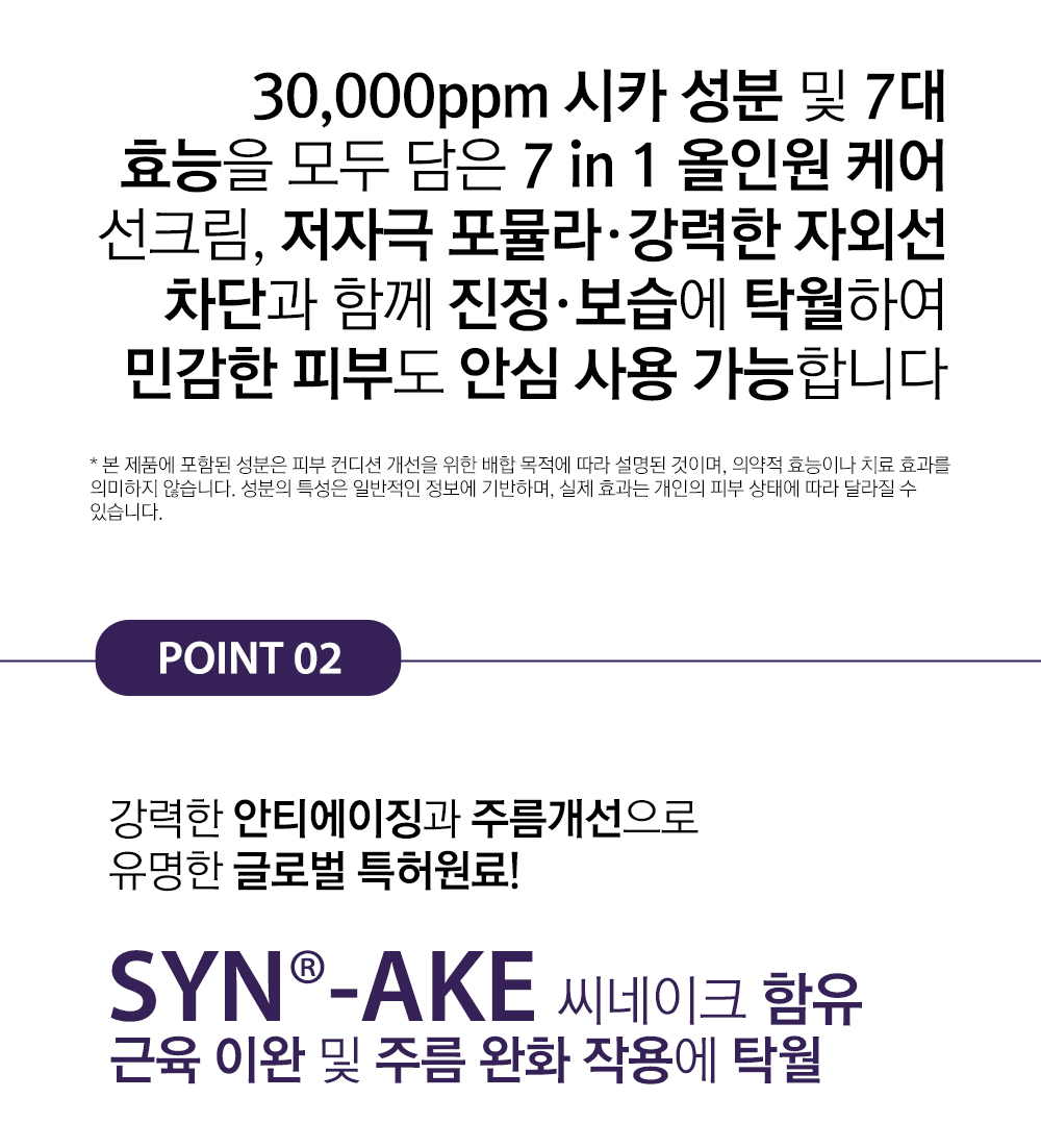 SPF50+ PA++++ 자외선 차단과 진정·보습·회복·주름개선·미백까지 5중 케어를 한 병에 담은 멀티 케어 선크림입니다. CICASOME·CCP Complex·10중 히알루론산 등 프리미엄 성분으로 피부를 빠르게 진정·회복시키고, 자연스러운 톤업과 촉촉한 물광 피부를 연출합니다. 민감 피부도 안심하고 매일 사용할 수 있는 데일리 선크림입니다.