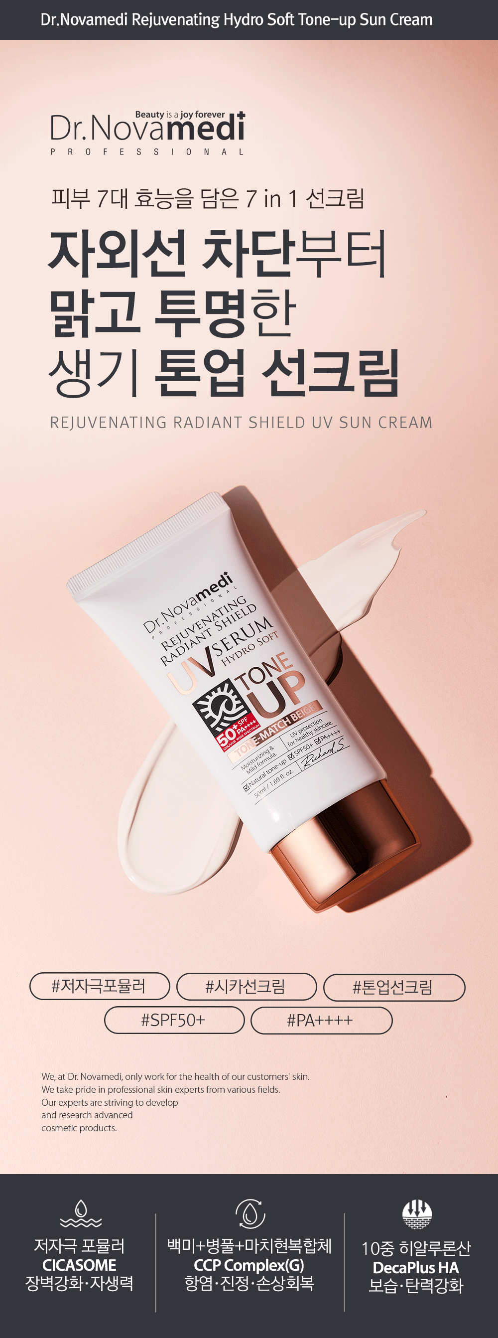 SPF50+ PA++++ UV defense with brightening, wrinkle care, soothing, and hydration. Powered by CICASOME, CCP Complex, and 10-layer Hyaluronic Acid, it calms and restores skin while creating a natural tone-up glow and dewy finish. Safe for daily use, even on sensitive skin.