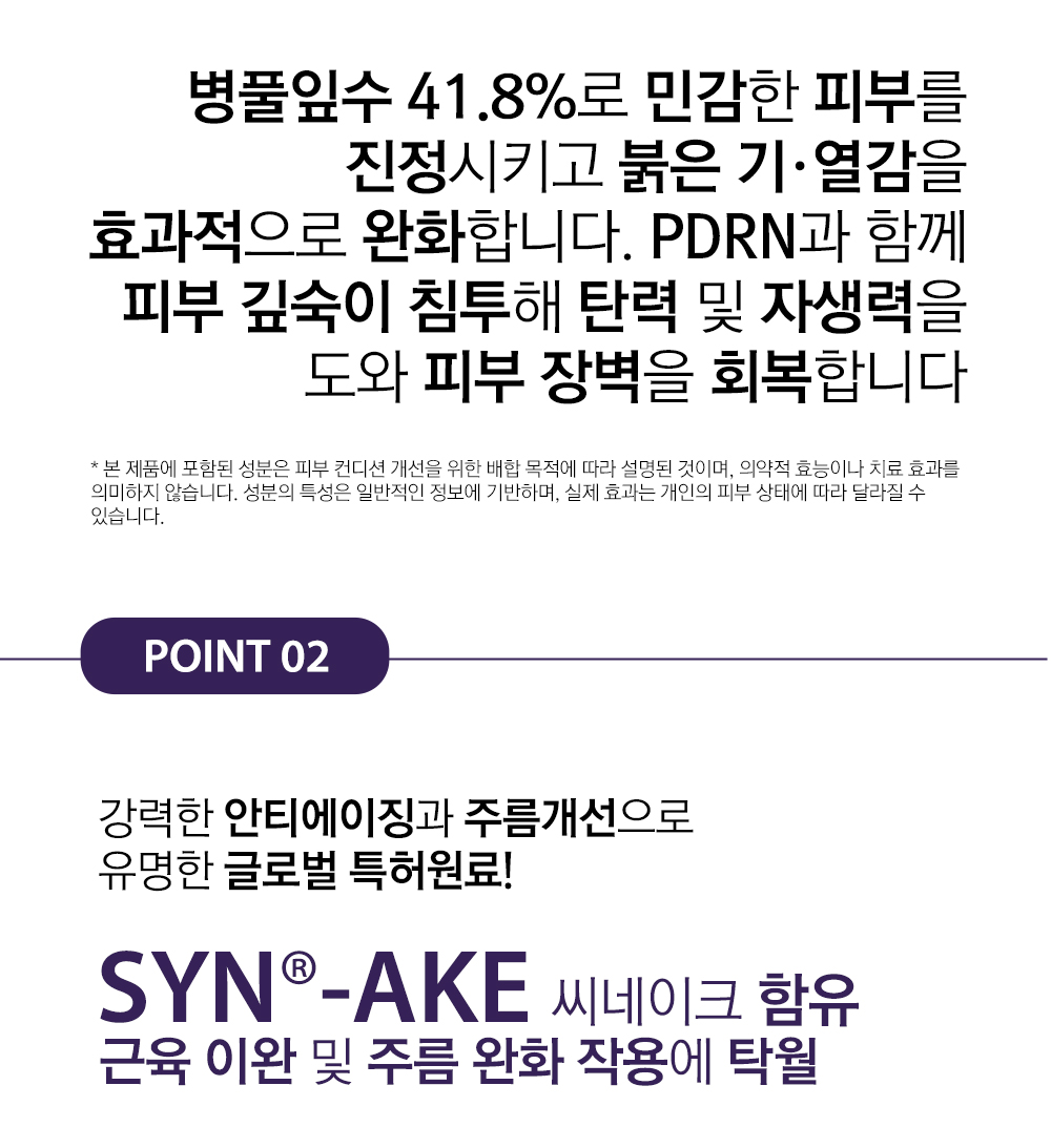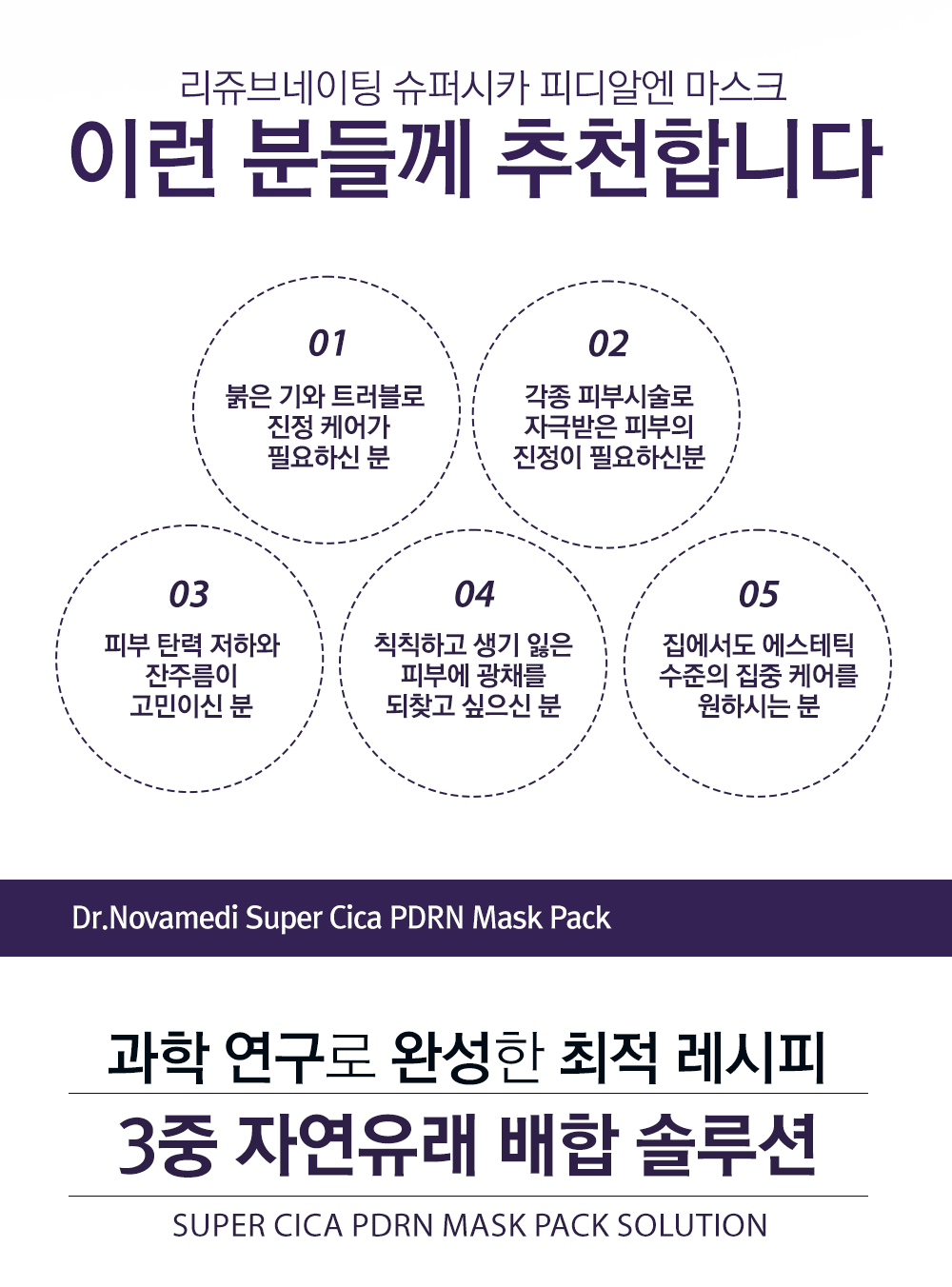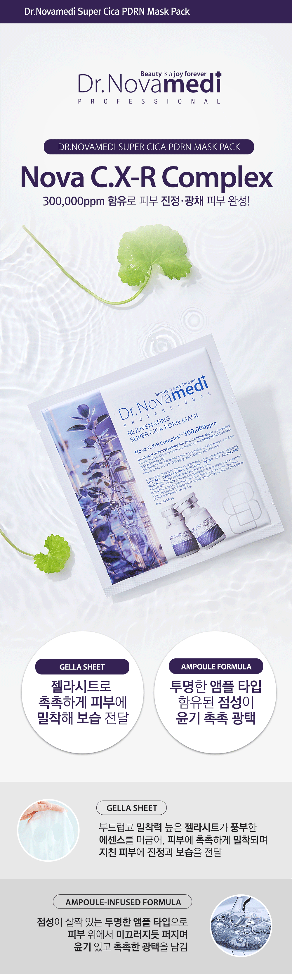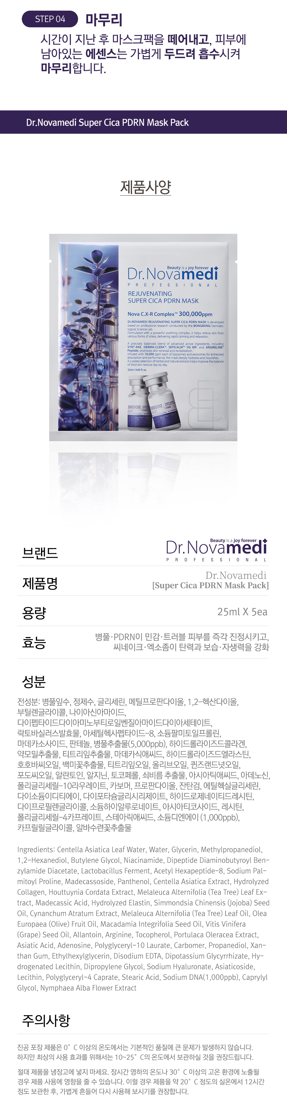정제수 대신 병풀잎수 41.8%를 담은 닥터노바메디 슈퍼시카 PDRN 마스크팩은 즉각적인 진정 효과를 제공합니다. 병풀추출물과 PDRN의 강력한 조합이 외부 자극에 민감해진 피부를 즉각적으로 진정시키고 붉은 기와 열감을 효과적으로 완화해 줍니다. 씨네이크와 엑소좀이 깊숙이 침투하여 탄력과 재생을 책임지며, 단 한 장만으로 에스테틱에서 받은 듯한 피부 광채와 윤기를 되찾아주는 고기능성 메디컬 케어 제품입니다.
