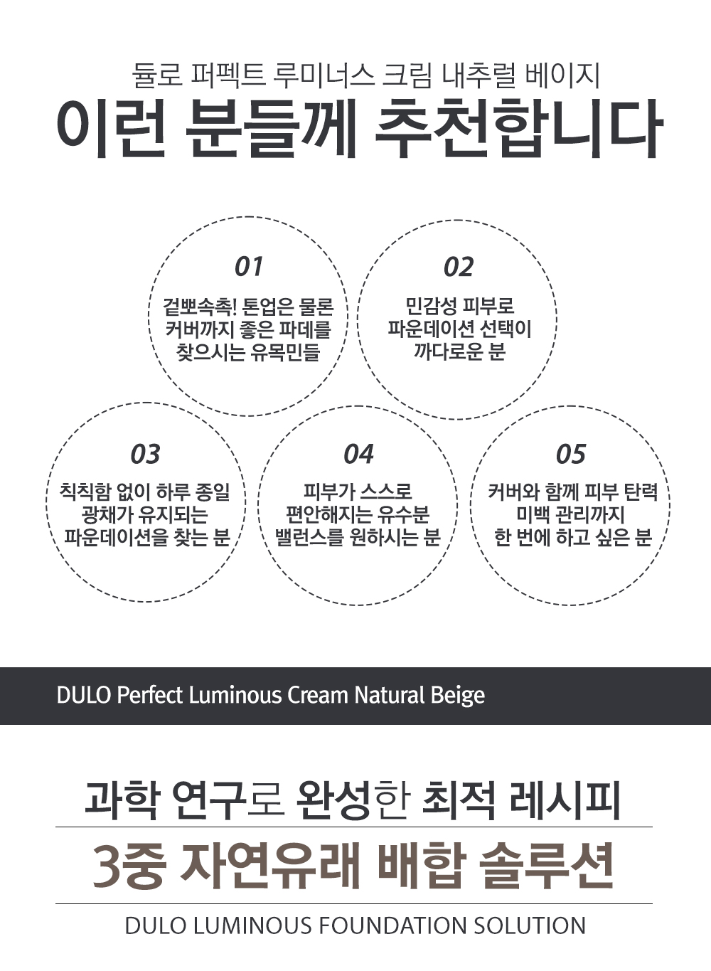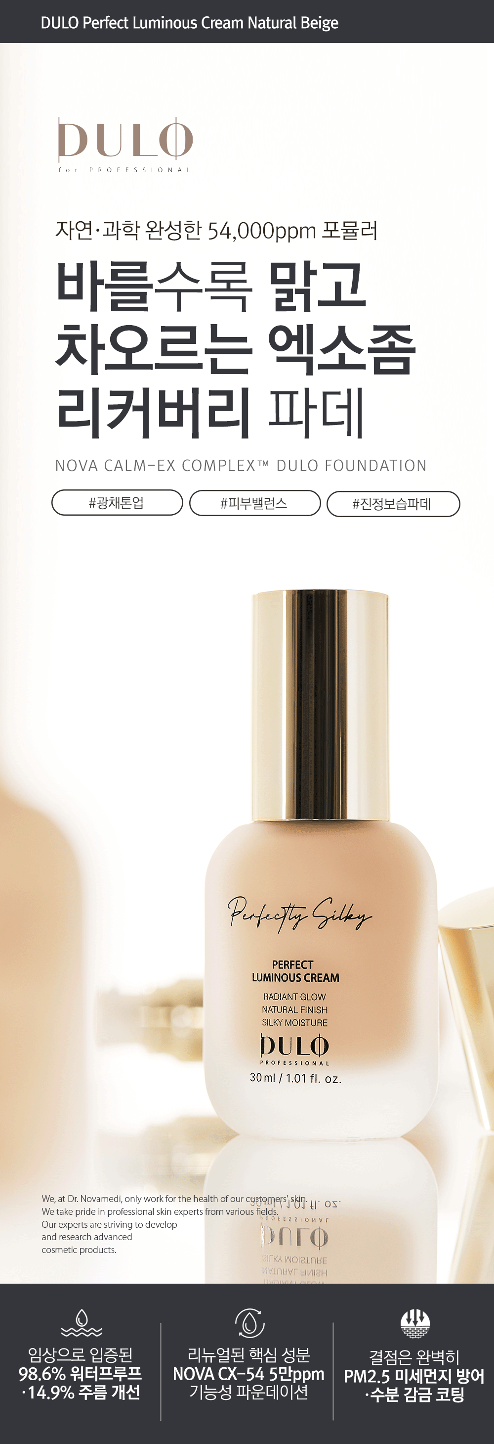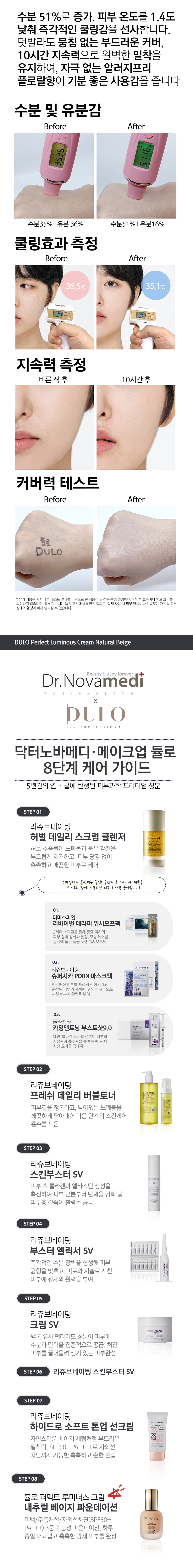 DULO Perfect Luminous Cream (Natural Beige) is a triple-function foundation for Whitening, Wrinkle Improvement, and UV Protection (SPF 50+, PA+++). Its exclusive NOVA CALM-EX COMPLEX™ (54,000 ppm) soothes sensitive skin and accelerates recovery. Featuring Niacinamide and Adenosine for a clear, firm, radiant glow, and Exosome Recovery Oil for all-day moisture. Achieve a smooth, natural beige, luminous finish with this silky formula.