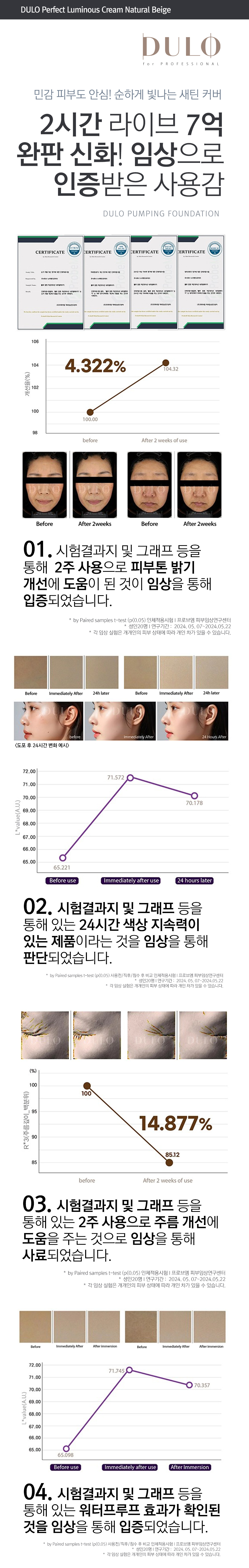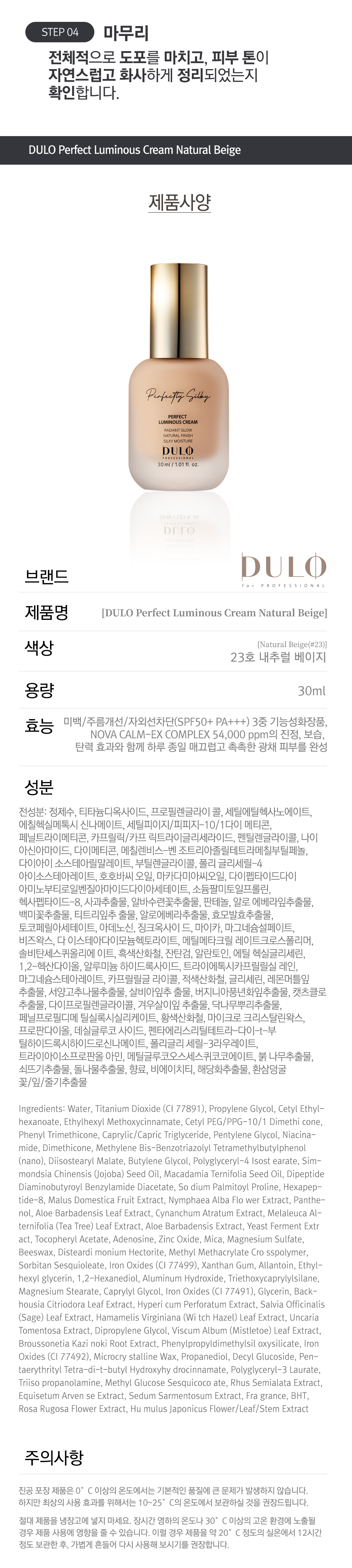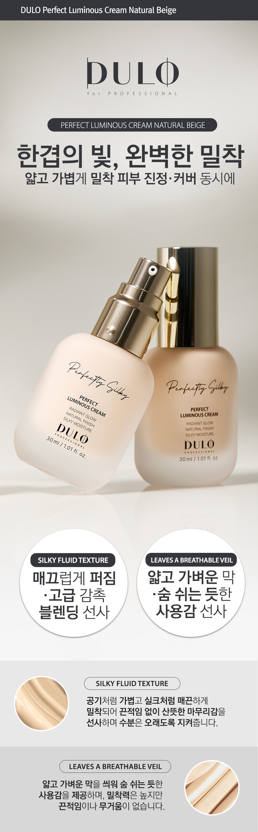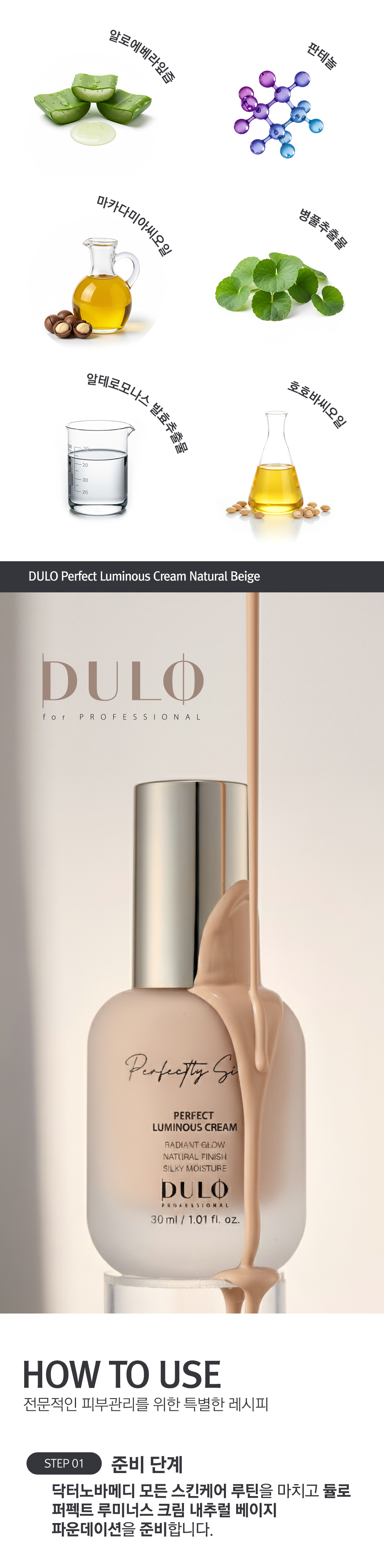 DULO Perfect Luminous Cream (Natural Beige) is a triple-function foundation for Whitening, Wrinkle Improvement, and UV Protection (SPF 50+, PA+++). Its exclusive NOVA CALM-EX COMPLEX™ (54,000 ppm) soothes sensitive skin and accelerates recovery. Featuring Niacinamide and Adenosine for a clear, firm, radiant glow, and Exosome Recovery Oil for all-day moisture. Achieve a smooth, natural beige, luminous finish with this silky formula.